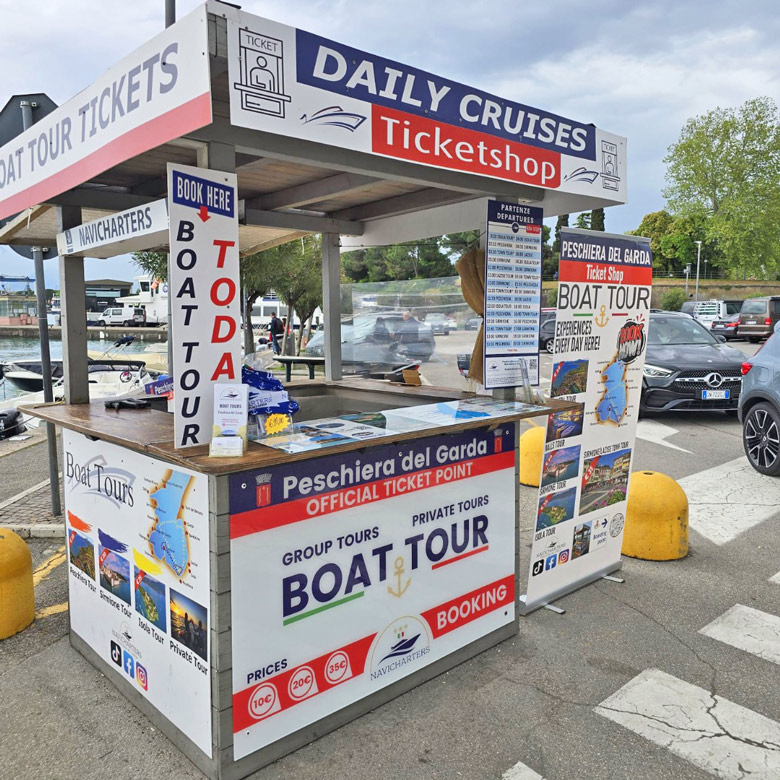 Wenn Sie den direkten Kontakt mit unseren Mitarbeitern bevorzugen, steht Ihnen der Helpdesk von Peschiera del Garda zur Verfügung! Der Navicharters-Empfangspunkt ist auch ein Treffpunkt, bevor man sich für die Touren zum Kai begibt. Er befindet sich auf dem Haupthafenplatz von Peschiera del Garda, der Piazza Maestro Giulio Battistoni.